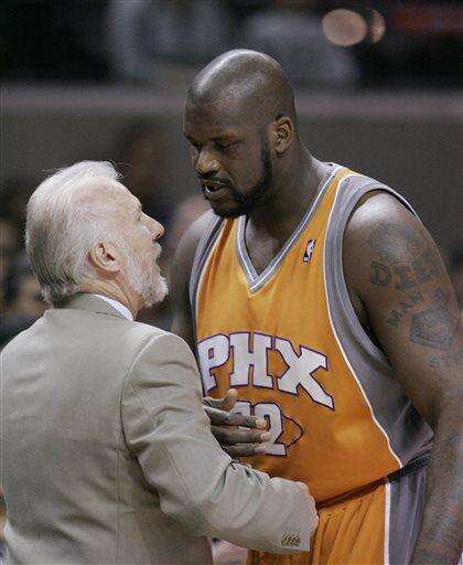 FILE - In this March 8, 2008, file photo, Phoenix Suns center Shaquille O'Neal, right, talks with San Antonio Spurs coach Gregg Popovich before and NBA basketball game in San Antonio. Hack-a-Shaq, the tactic of fouling bad foul shooters on purpose to send them to the line and slow their team's offense to a crawl, used to be a laughing matter. It isn't anymore, and has raised the ire of everyone from booing fans to NBA Commissioner Adam Silver himself and will likely be something the league tries to curb in the coming months. (AP Photo/Eric Gay, File) The Associated Press