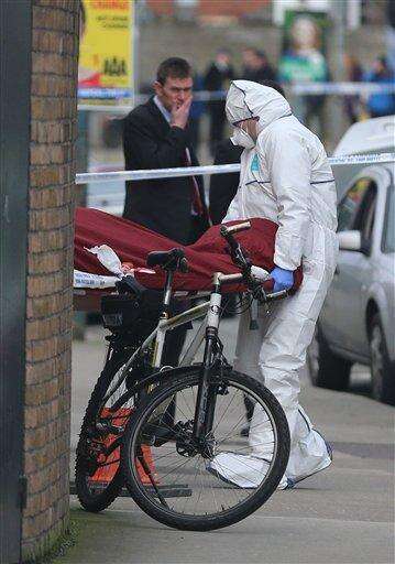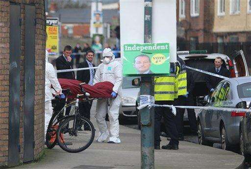 The body of Eddie Hutch is removed from a property in Poplar Row in Dublin, Ireland, Tuesday, Feb. 9, 2016. Irelandâs justice minister urged gang members to seek police protection Tuesday after gunmen shot to death the brother of a Dublin crime kingpin in apparent retaliation for last weekâs attack on a boxing weigh-in ceremony. Justice Minister Frances Fitzgerald spoke hours after the most brazen assault yet on the authority of Gerry "The Monk" Hutch, the Dublin crime figure behind many of Irelandâs most daring bank heists. His faction has been blamed for Fridayâs attack on the hotel boxing event, where a henchman from a rival gang led by Spain-based Christy Kinahan was targeted and killed. In apparent retaliation, gunmen on Monday night broke into the Dublin home of Hutchâs brother Eddie and fatally shot the 59-year-old several times in the hallway. (Niall Carson/PA via AP) UNITED KINGDOM OUT - NO SALES - NO ARCHIVES