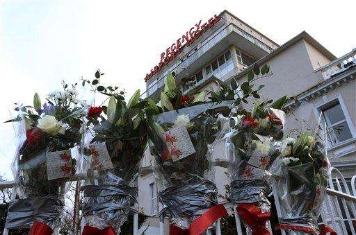Flowers are left outside the Regency Hotel after one man died and two others were injured following a shooting incident at the hotel where a weigh-in for a boxing match was taking place, in Dublin, Ireland, Tuesday, Feb. 9, 2016. As Dublin's gangland tensions deepened, Ireland's justice minister urged gang members to seek police protection Tuesday after gunmen shot to death the brother of a Dublin crime kingpin in apparent retaliation for last week's deadly attack on a boxing ceremony. Police have put in roadblocks, increased surveillance on high-profile targets and placed an imprisoned relative of a crime boss into protective custody. (Brian Lawless/PA via AP) UNITED KINGDOM OUT - NO SALES - NO ARCHIVES