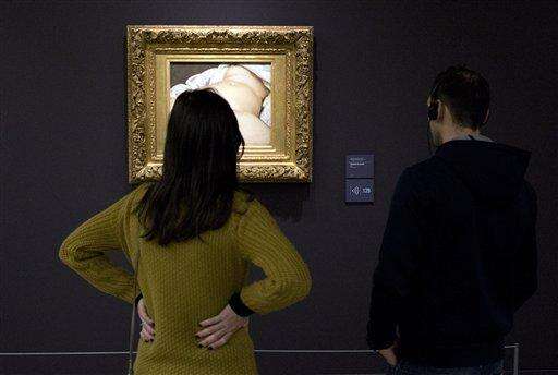 Visitors look at Gustave Courbet's 1866 "The Origin of the World," painting which depicts female genitalia at Orsay museum, in Paris, France, Friday, Feb. 12, 2016. Facebook lost a crucial legal battle Friday as a Paris court ruled the social network can be sued in France over its decision to remove the account of a French user who posted a photo of Courbet's famous 19th-century nude painting. (AP Photo/Francois Mori) The Associated Press
