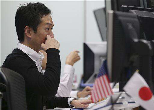 A money trader reacts in front of the computer monitors at a foreign exchange brokerage in Tokyo, Friday, Feb. 12, 2016. In currency trading, the dollar edged lower to 112.24 yen from 112.29 the previous day. The euro fell to $1.1309 from $1.1315. (AP Photo/Koji Sasahara)