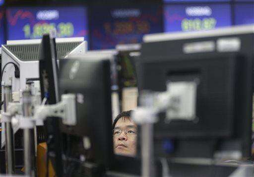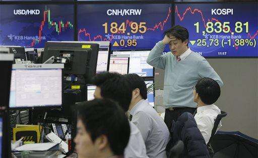 A currency trader watches monitors at the foreign exchange dealing room of the KEB Hana Bank headquarters in Seoul, South Korea, Friday, Feb. 12, 2016. Japanâs main stock index dived Friday, leading other Asian markets lower, after a sell-off in banking shares roiled investors in the U.S. and Europe. (AP Photo/Ahn Young-joon)