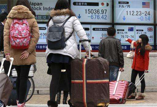 Foreign tourists walk past an electronic stock board showing Japan's Nikkei 225 in Tokyo, Friday, Feb. 12, 2016. Japan's benchmark stock index dived more than 5 percent Friday following a sell-off in European and U.S. markets. (AP Photo/Eugene Hoshiko)