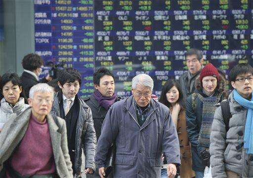 People walk by an electronic stock board of a securities firm in Tokyo, Friday, Feb. 12, 2016. Japan's main stock index dived Friday, leading other Asian markets lower, after a sell-off in banking shares roiled investors in the U.S. and Europe. (AP Photo/Koji Sasahara)