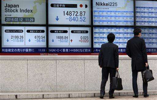 Men look at an electronic stock board showing Japan's Nikkei 225 in Tokyo, Friday, Feb. 12, 2016. Asian shares fell Friday, with Japanâs Nikkei 225 index tumbling more than 5 percent following a sell-off in European and U.S. markets. (AP Photo/Eugene Hoshiko)