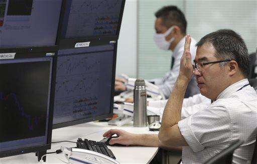 People stand in front of an electronic stock board of a securities firm in Tokyo, Friday, Feb. 12, 2016. Japan's main stock index dived Friday, leading other Asian markets lower, after a sell-off in banking shares roiled investors in the U.S. and Europe. (AP Photo/Koji Sasahara)