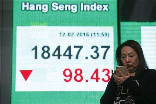 A woman uses her smartphone in front of an electronic board showing the Hong Kong index at a bank in Hong Kong, Friday, Feb. 12, 2016. Japanâs main stock index dived Friday, leading other Asian markets lower, after a sell-off in banking shares roiled investors in the U.S. and Europe. (AP Photo/Kin Cheung)