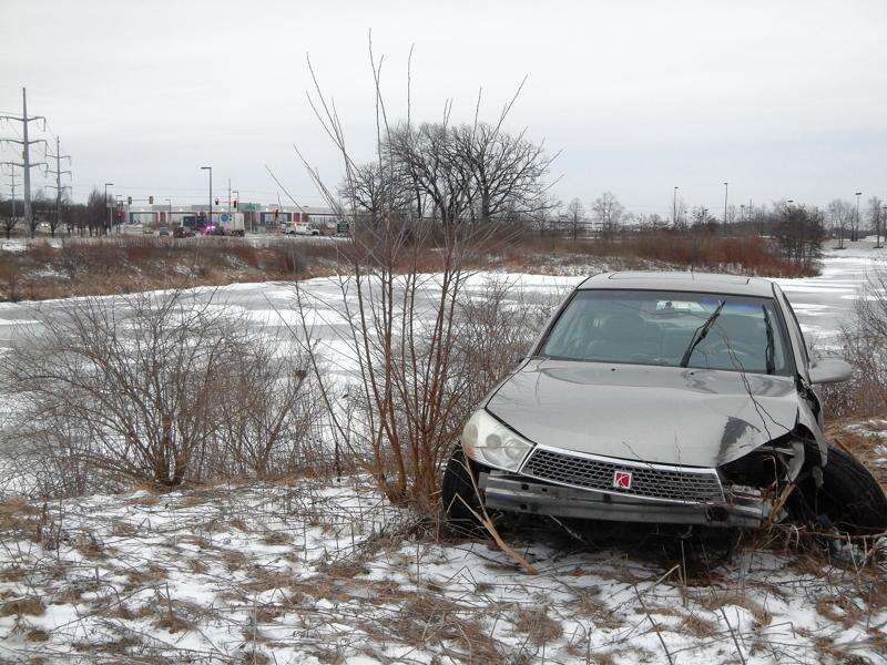 A 2003 Saturn heading west on Freeman Road struck a traffic signal early Friday, left the roadway and skidded across a frozen pond, police said. They found the vehicle unoccupied with severe front-end damage. Courtesy of Huntley Police Department