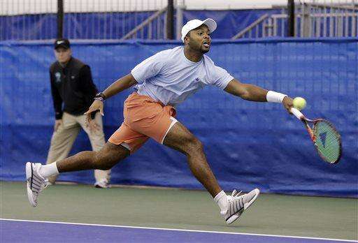 Donald Young returns a shot to Ricardas Berankis, of Lithuania, in a quarterfinal at the Memphis Open tennis tournament Friday, Feb. 12, 2016, in Memphis, Tenn. (AP Photo/Mark Humphrey) The Associated Press
