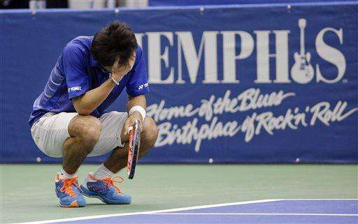 Yoshihito Nishioka, of Japan, reacts after losing a point to Sam Querrey in a quarterfinal at the Memphis Open tennis tournament Friday, Feb. 12, 2016, in Memphis, Tenn. Querrey won the match 6-3, 6-4. (AP Photo/Mark Humphrey) The Associated Press