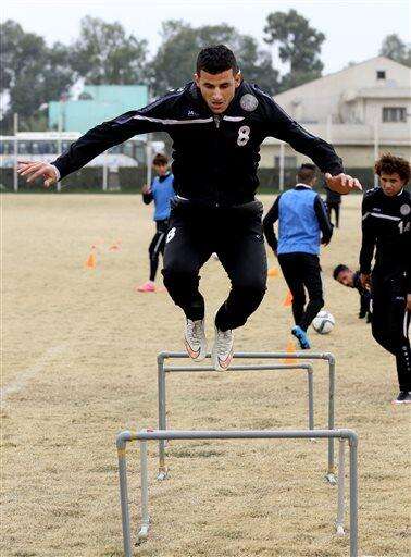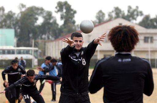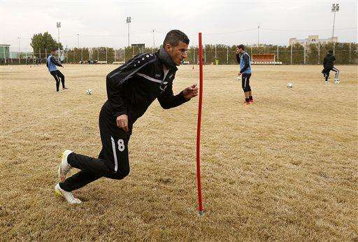 In this Saturday, Feb. 6, 2016 photo, Soccer player Ayman Hussein, left, trains with his team in Baghdad, Iraq. Islamic State militants drove Hussein from his home. Eighteen months later, he sent Iraq’s soccer team to the Olympics. Hussein kicked the game-winning goal against Qatar last month in a qualifying match, uniting Iraqis in a rare moment of triumph and becoming a national celebrity. But his journey to Brazil has been marked by the same violence and displacement that have shattered the lives of so many of his fans. (AP Photo/Hadi Mizban) The Associated Press