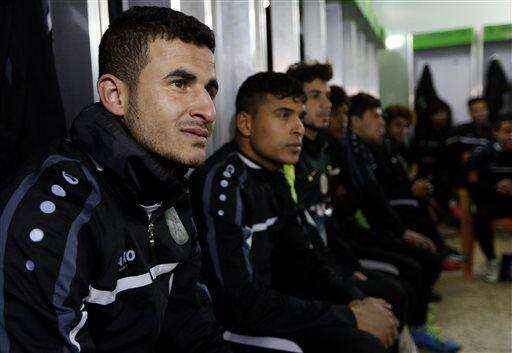 In this Saturday, Feb. 6, 2016 photo, soccer player Ayman Hussein, left, sits with his team in a locker room in Baghdad, Iraq. Islamic State militants drove Hussein from his home. Eighteen months later, he sent Iraq’s soccer team to the Olympics. Hussein kicked the game-winning goal against Qatar last month in a qualifying match, uniting Iraqis in a rare moment of triumph and becoming a national celebrity. But his journey to Brazil has been marked by the same violence and displacement that have shattered the lives of so many of his fans. (AP Photo/Hadi Mizban) The Associated Press