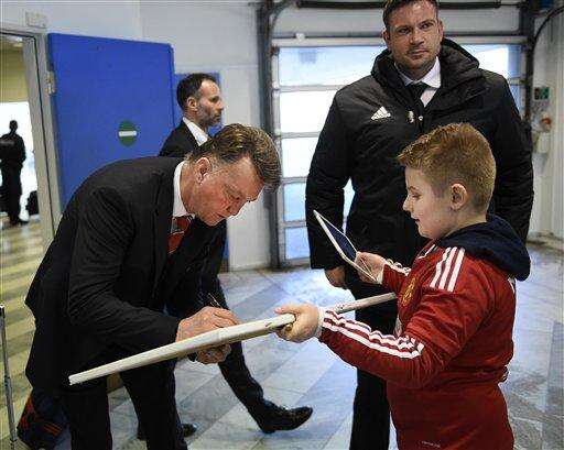 Manchester United manager Louis van Gaal signs an autograph after arriving at Karup Airport, Denmark on Wednesday, Feb. 17 2016. United will play Danish team FC Midtjylland in a Europa League soccer match on Thursday. (Lars Poulsen, POLFOTO via AP ) DENMARK OUT The Associated Press