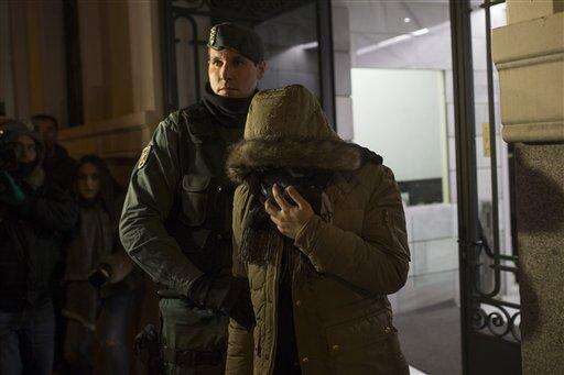 A Spanish Civil Guard escorts a detained man while leaving China's ICBC bank offices in Madrid, Spain, Wednesday, Feb. 17, 2016. Spanish police searched offices of China's ICBC bank in downtown Madrid and arrested five people Wednesday as part of a money laundering and tax fraud probe. (AP Photo/Francisco Seco)