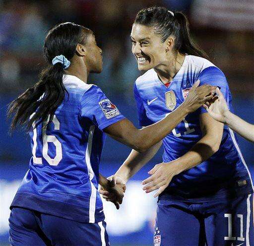 United States forward Crystal Dunn (16) is congratulated by defender Alexandra Krieger (11) after scoring a goal during the first half of a women's Olympic qualifying soccer match against Puerto Rico, Monday, Feb. 15, 2016 in Frisco, Texas. (AP Photo/Brandon Wade) The Associated Press