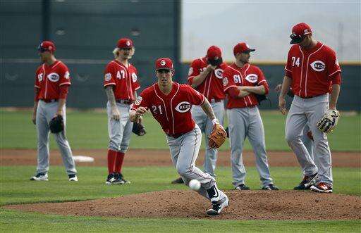 Cincinnati Reds players get ready to throw during a spring training baseball workout Thursday, Feb. 18, 2016, in Goodyear, Ariz. (AP Photo/Morry Gash)