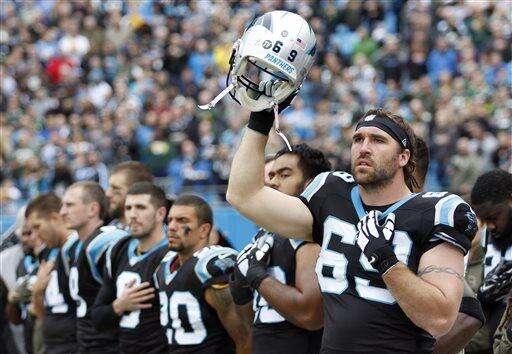 FILE - In this Nov. 8, 2015, file photo, Carolina Panthers' Jared Allen (69) gestures during the National Anthem before an NFL football game against the Green Bay Packers in Charlotte, N.C. Jared Allen announced his retirement from football on Twitter, Thursday, Feb. 18, 2016. (AP Photo/Bob Leverone, File) The Associated Press