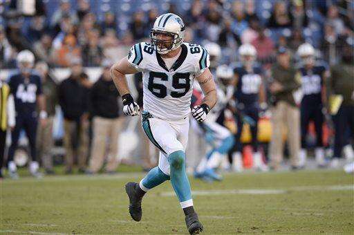 FILE - In this Nov. 15, 2015, file photo, Carolina Panthers defensive end Jared Allen plays against the Tennessee Titans in the second half of an NFL football game, in Nashville, Tenn. Jared Allen announced his retirement from football on Twitter, Thursday, Feb. 18, 2016. (AP Photo/Mark Zaleski, File) The Associated Press