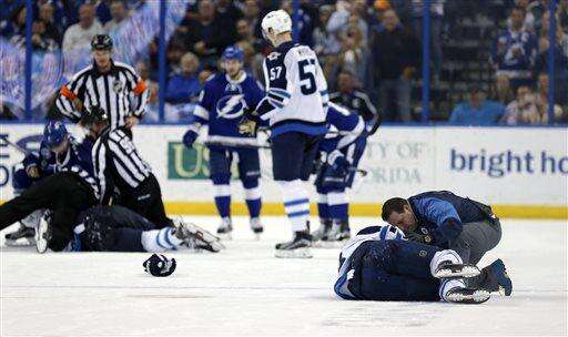 Winnipeg's Bryan Little was hurt late in the second period and needed assistance off the ice before heading to the locker room. It appeared Hedman made contact in the neutral zone with Little, who looked like he lost his balance and lowered his head before getting hit by Anton Stralman.