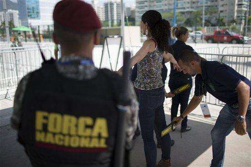Police officers scan persons entering the Maria Lenk Aquatics Center, at the Olympic Park in Rio de Janeiro, Brazil, Friday, Feb. 19, 2016. More than 280 security personnel are in place to safeguard the Aquatics Center, athletes, and public attending the ongoing FINA World Diving Cup. The security operation is also part practice for the Rio 2016 Olympic Games. (AP Photo/Leo Correa) The Associated Press