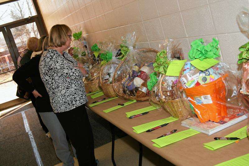People examine raffle prizes at the Crop for a Cause scrapbooking event. Courtesy of Laura Machonis