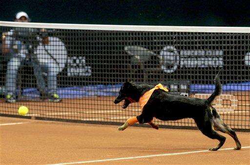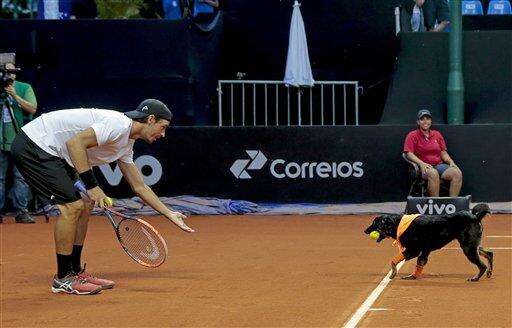 Portugal's Gastao Elias receives a ball from a dog during the Brazil Open tennis tournament in Sao Paulo, Brazil, Thursday, Feb. 25, 2016. Four trained shelter dogs that once roamed the streets of Sao Paulo found themselves center stage at the ATP 250 Brazil Open tournament. The unusual initiative was made to promote the adoption of abandoned street animals. (AP Photo/Leandro Martins) The Associated Press
