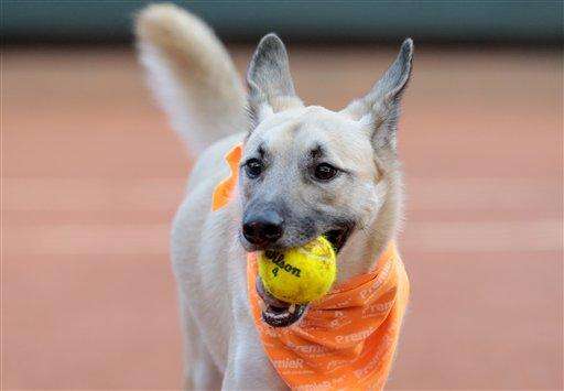 The shelter dogs, wearing orange ribbons and trained for months, spent almost a half-hour tracking down balls often intentionally missed by the 122nd and 140th ranked players. Baena and Elias will play for real Friday in the ATP tournament's quarter-finals.
