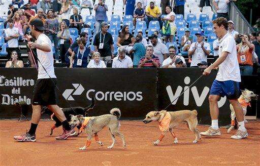 Tennis players Gastao Elias, left, from Portugal and Roberto Carballes from Spain enter the tennis court with four trained ball retrieving dogs, during an exhibition match of the Brazil Open tournament in Sao Paulo, Brazil, Thursday, Feb. 25, 2016. The four trained shelter dogs that once roamed the streets of Sao Paulo found themselves center stage at the ATP 250 Brazil Open tournament. The unusual initiative was made to promote the adoption of abandoned street animals.(AP Photo/Leandro Martins) The Associated Press