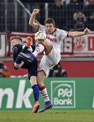 Berlin's Mitchell Weiser and Cologne's Dominique Heintz, from left, challenge for the ball during the German Bundesliga soccer match between 1.FC Cologne and Hertha BSC Berlin in Cologne, Germany, Friday, Feb. 26, 2016. (AP Photo/Martin Meissner)