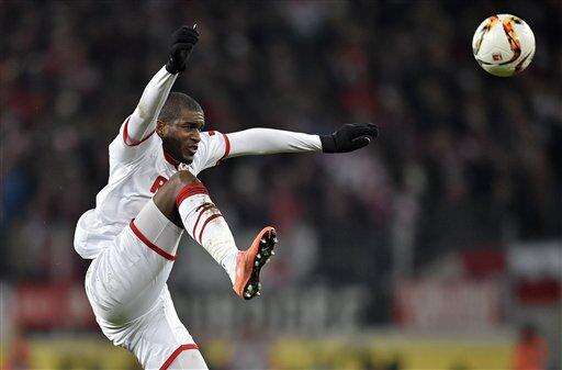 Cologne's Anthony Modeste jumps for the ball during the German Bundesliga soccer match between 1.FC Cologne and Hertha BSC Berlin in Cologne, Germany, Friday, Feb. 26, 2016. (AP Photo/Martin Meissner)