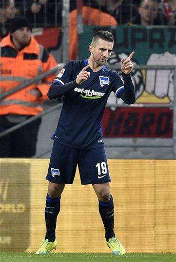 Berlinâs Vedad Ibisevic celebrates after scoring the opening goal during the German Bundesliga soccer match between 1.FC Cologne and Hertha BSC Berlin in Cologne, Germany, Friday, Feb. 26, 2016. (AP Photo/Martin Meissner)