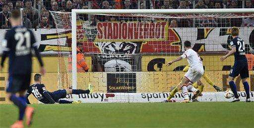 Berlinâs Vedad Ibisevic scores the opening goal during the German Bundesliga soccer match between 1.FC Cologne and Hertha BSC Berlin in Cologne, Germany, Friday, Feb. 26, 2016. (AP Photo/Martin Meissner)
