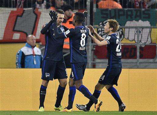 Berlinâs Vedad Ibisevic, left, celebrates after scoring the opening goal during the German Bundesliga soccer match between 1.FC Cologne and Hertha BSC Berlin in Cologne, Germany, Friday, Feb. 26, 2016. (AP Photo/Martin Meissner)