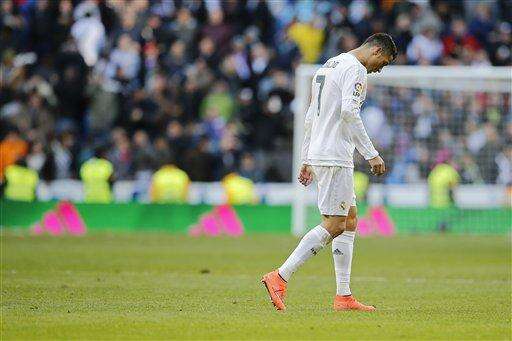 Real Madrid's Cristiano Ronaldo walks off the pitch at the end of a Spanish La Liga soccer match between Real Madrid and Atletico Madrid at the Santiago Bernabeu stadium in Madrid, Spain, Saturday Feb. 27, 2016. Atletico won the match 1-0. (AP Photo/Paul White) The Associated Press