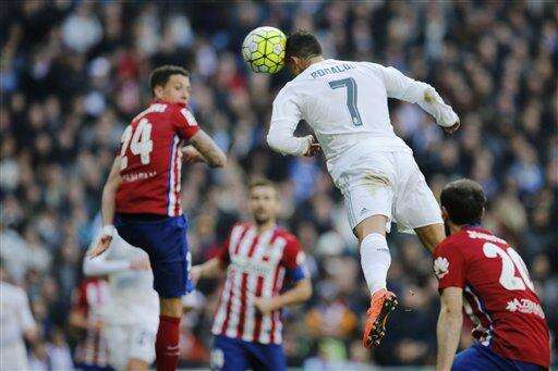 Real Madrid's Cristiano Ronaldo, right, jumps to head the ball towards the goal during a Spanish La Liga soccer match between Real Madrid and Atletico Madrid at the Santiago Bernabeu stadium in Madrid, Spain, Saturday Feb. 27, 2016. (AP Photo/Paul White) The Associated Press