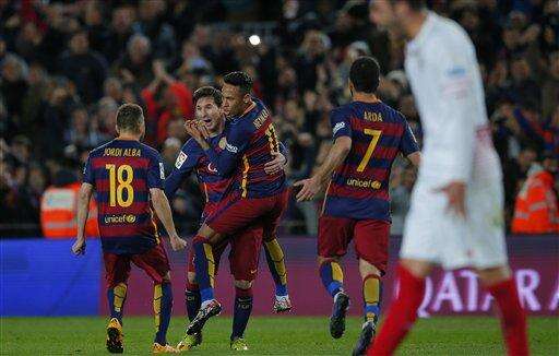 BARCELONA, Spain (AP) - Lionel Messi scored with an unstoppable free kick to help Barcelona come from behind to beat Sevilla 2-1 on Sunday, a record-equaling 34th game without loss that kept the champions on track to retain their Spanish league title.