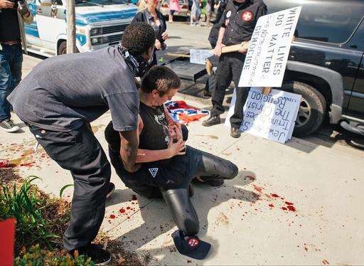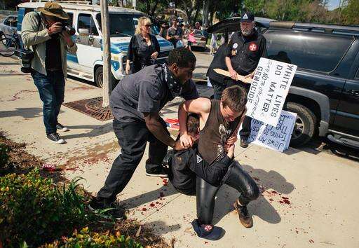 Counter protesters scuffle with a Ku Klux Klansman after members of the KKK tried to start a "White Lives Matter" rally at Pearson Park in Anaheim on Saturday, Feb. 27, 2016. The event quickly escalated into violence and at least two people had to be treated at the scene for stab wounds, (Luis Sinco/Los Angeles Times via AP) The Associated Press