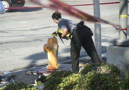 Anaheim Police Department forensics officer Jeannette Torres investigates the scene in Anaheim, Calif., Saturday, Feb. 27, 2016, after a small group of Ku Klux Klan members staging an anti-immigrant rally clashed with a larger gathering of counter-protesters, police said. Three people were stabbed Saturday, one critically, during the clash. (Ed Crisostomo/The Orange County Register via AP) MAGS OUT; LOS ANGELES TIMES OUT; MANDATORY CREDIT Photo by ED CRISOSTOMO, THE ORANGE COUNTY REGISTER The Associated Press