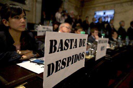 A sign reading in Spanish "Stop the layoffs" sits on the desk of legislators from the opposition as Argentina's President Mauricio Macri opens the 2016 session of Congress in Buenos Aires, Argentina, Tuesday, March 1, 2016. A deal between Argentina and a group of U.S. creditors in a longstanding debt standoff, has given President Macri a boost. Macri assumed power in December after campaigning on promises to modernize South America's second-largest economy by solving the dispute and attracting foreign investment. (AP Photo/Natacha Pisarenko) The Associated Press