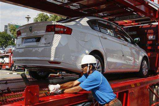 A Proton worker loads a car onto the carrier at the Proton Centre of Excellence Complex in Kuala Lumpur, Malaysia, Tuesday, March 1, 2016. Malaysian national car company Proton says it has begun shipping left-hand drive sedans to Chile as it seeks to tap new markets and revitalize exports. (AP Photo/Joshua Paul)