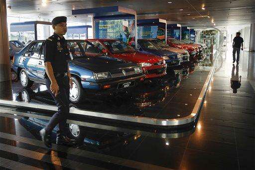 A Malaysian policeman walks by a fleet of national cars on display at the Proton Centre of Excellence Complex in Kuala Lumpur, Malaysia, Tuesday, March 1, 2016. Malaysian national car company Proton says it has begun shipping left-hand drive sedans to Chile as it seeks to tap new markets and revitalize exports. (AP Photo/Joshua Paul)