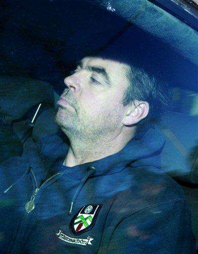 FILE - This is a Friday, April, 11, 2014 file photo of Seamus Daly, as he arrives in a police car at Dungannon Court, Northern Ireland, Friday, April, 11, 2014. Prosecutors say the case has collapsed against Seamus Daly the man charged with the murder of 29 people in Omagh in 1998, scene of the deadliest bombing in the history of the Northern Ireland conflict. (AP Photo/Peter Morrison, File)