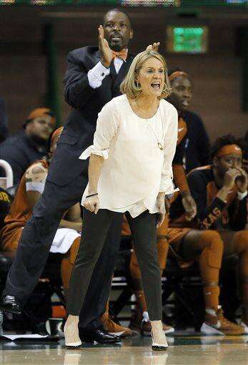 Texas head coach Karen Aston instructs her team in the first half of an NCAA college basketball game against Baylor on Monday, Feb. 29, 2016, in Waco, Texas. (AP Photo/Tony Gutierrez) The Associated Press