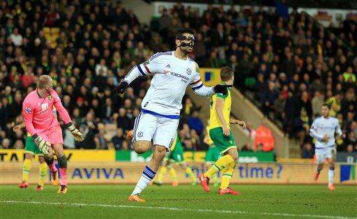Chelsea's Diego Costa celebrates scoring his side's second goal against Norwich City during their English Premier League soccer match at Carrow Road, Norwich, England, Tuesday, March 1, 2016. (Adam Davy/PA via AP) UNITED KINGDOM OUT - NO SALES - NO ARCHIVES