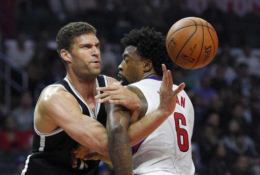 Brooklyn Nets center Brook Lopez, left, tangles with Los Angeles Clippers center DeAndre Jordan as he passes during the first half of an NBA basketball game, Monday, Feb. 29, 2016, in Los Angeles. (AP Photo/Mark J. Terrill) The Associated Press
