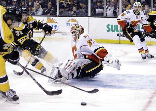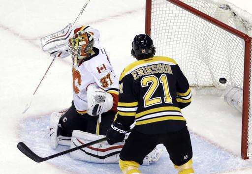 Joni Ortio had 23 saves for Calgary, but had little chance on either of Boston's goals, one-timers by Ferraro and Bergeron.