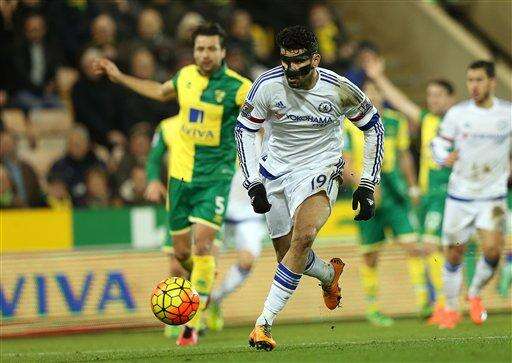 Chelsea's Diego Costa controls the ball during the English Premier League soccer match against Norwich City at Carrow Road, Norwich, England, Tuesday March 1, 2016. (Adam Davy/PA via AP) UNITED KINGDOM OUT The Associated Press