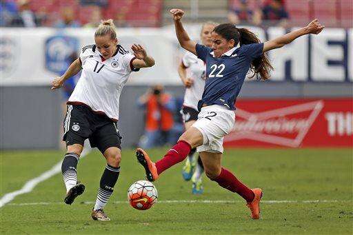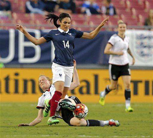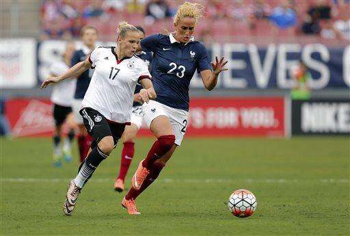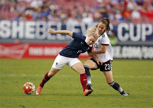 Germany's Isabel Kerschowski, left, races past France's Kheira Hamraoui for the ball during the first half of a SheBelieves Cup women's soccer match Thursday March 3, 2016, in Tampa, Fla. (AP Photo/Mike Carlson) The Associated Press