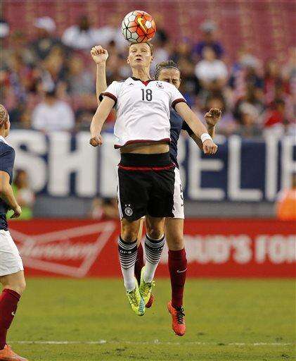 Germany's Alexandra Popp heads the ball during the second half of a SheBelieves Cup women's soccer match against France, Thursday, March 3, 2016, in Tampa, Fla. (AP Photo/Mike Carlson) The Associated Press