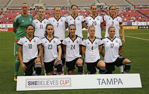 Members of the German women's national team pose prior to their game against France in the SheBelieves Cup women's soccer match Thursday March 3, 2016, in Tampa, Fla. (AP Photo/Mike Carlson) The Associated Press